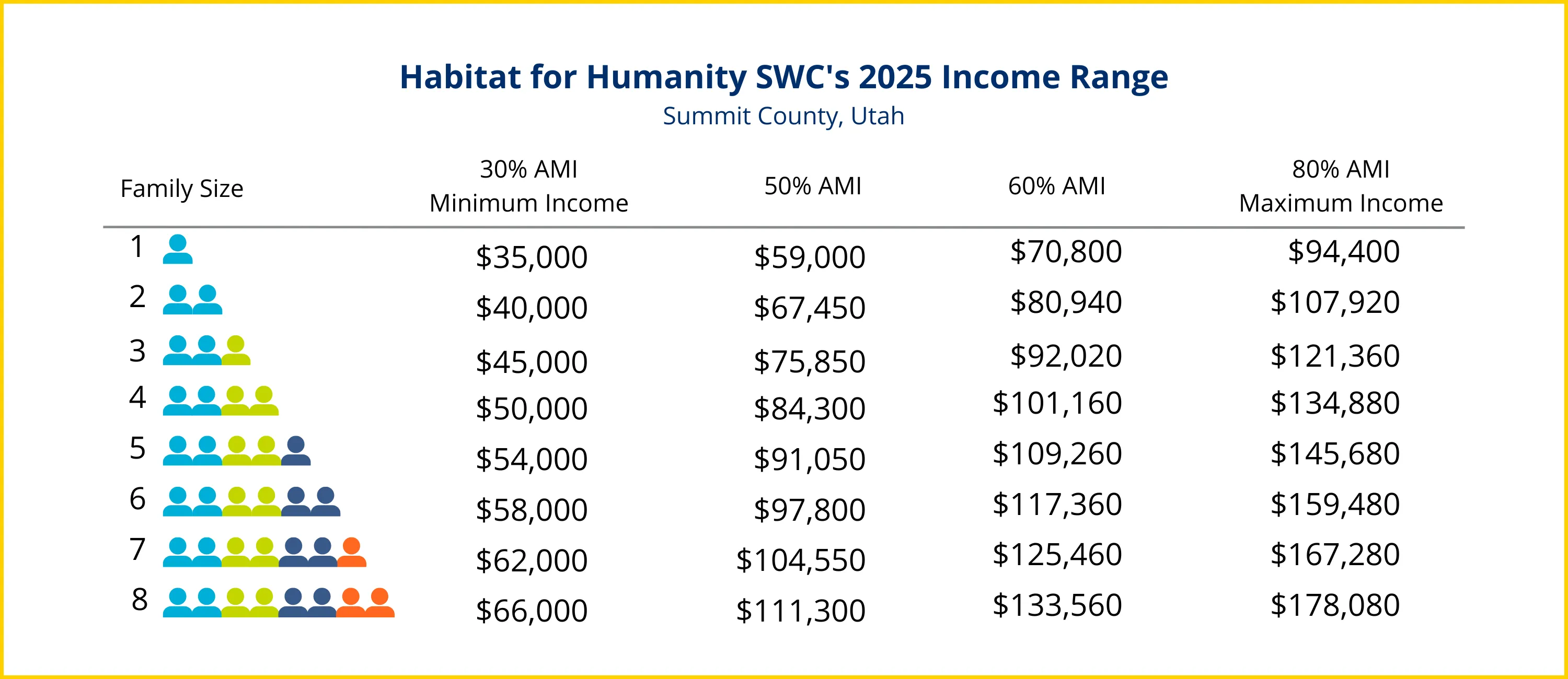2. Income between 30% - 80% of the Summit County Area Median Income for their household size. The chart below offers the latest numbers for the segment of the community we serve. (AMI targets will depend on the project. For example, the current build at Silver Creek Village will target income between 30% - 60%.)